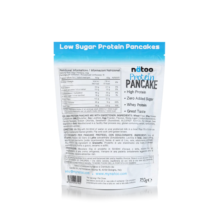 Protein Pancake Nätoo è un preparato in polvere istantaneo arricchito con proteine del siero del latte (whey) per la preparazione di deliziosi pancake proteici