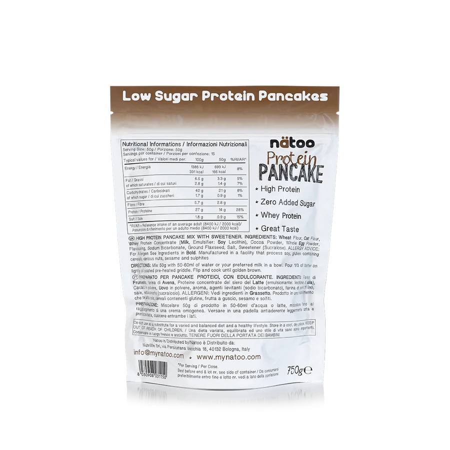 Protein Pancake Nätoo è un preparato in polvere istantaneo arricchito con proteine del siero del latte (whey) per la preparazione di deliziosi pancake proteici.